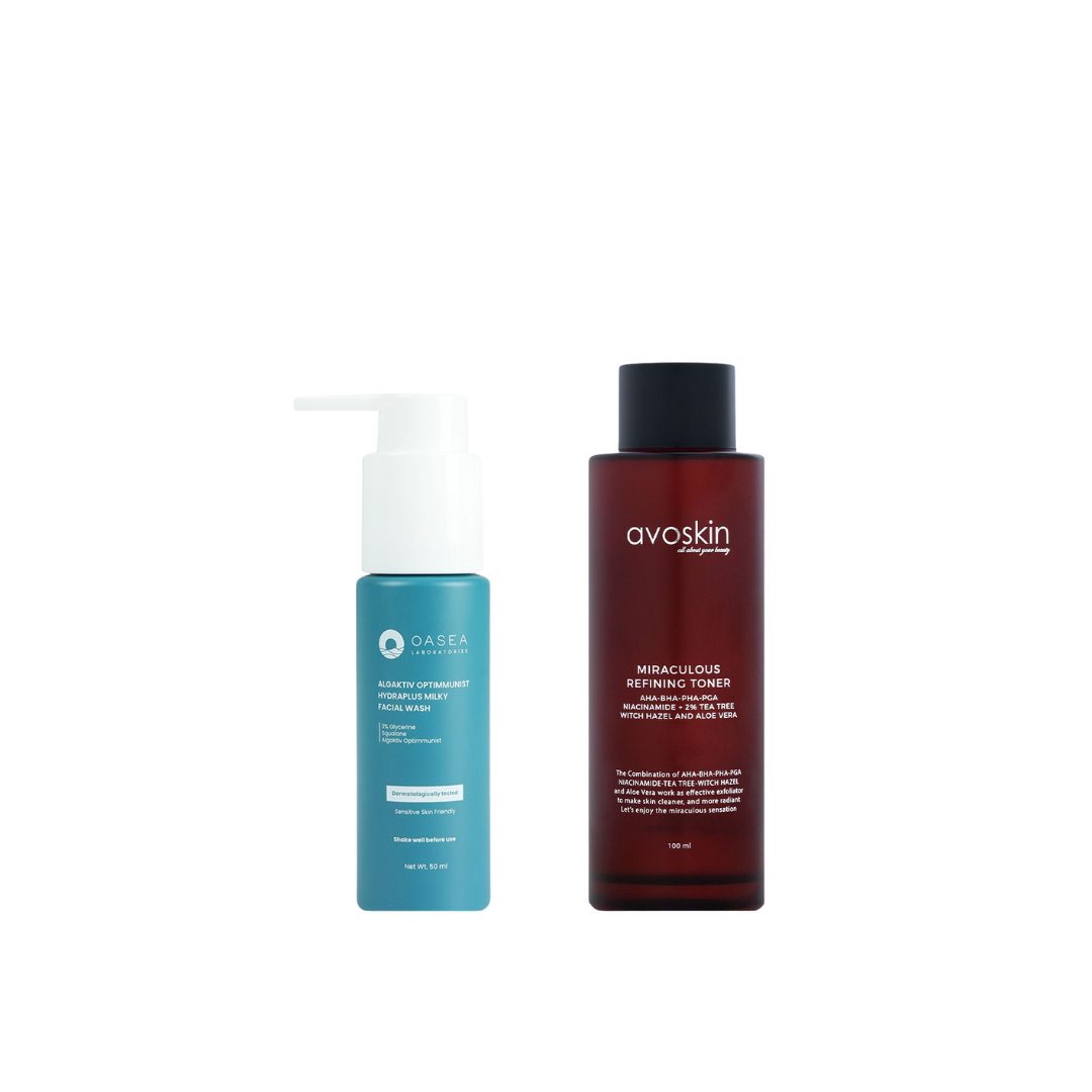 The Avoskin product range consists of 100 ml Miraculous Refining Toner and 30 ml Miraculous Refining Serum which function optimally to exfoliate the skin. Miraculous Refining Toner is an exfoliating toner from Avoskin which contains AHA-BHA-PHA-PGA combined with Niacinamide, Tea Tree, Witch Hazel, and Aloe Vera. The combination of these ingredients makes this product effective for maximizing the skin exfoliation process while maintaining skin moisture, disguise black spots, reduce the appearance of pores, smooth skin texture, help brighten and even out skin tone. Miraculous Refining Serum is an exfoliating serum that contains 10% AHA, 3% BHA equipped with Niacinamide, Ceramide, and other supporting ingredients that make this serum effective in helping the process of exfoliating dead skin cells and stimulating skin cell regeneration. So that the skin will look brighter, even texture, softer skin, and overcome acne and blackheads.