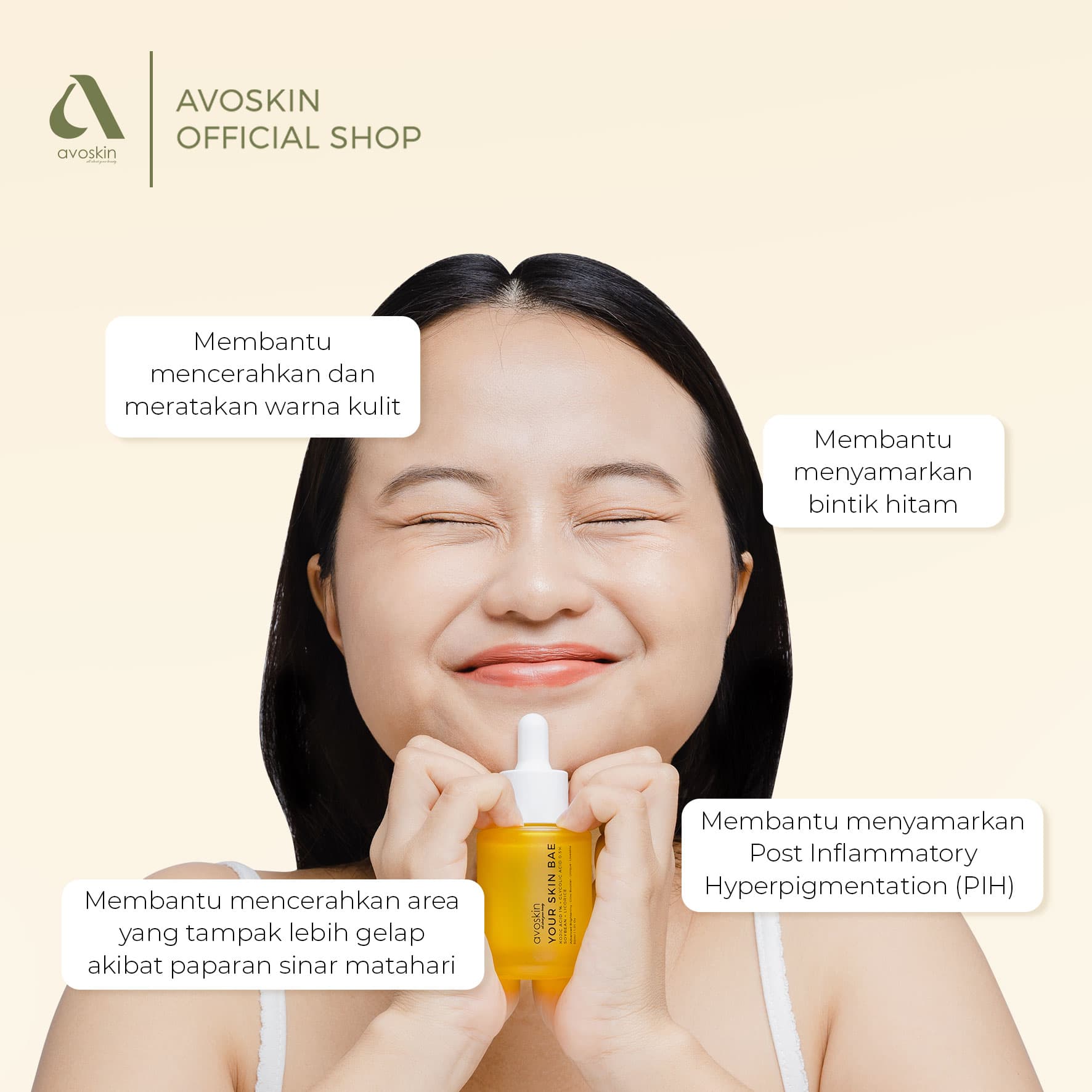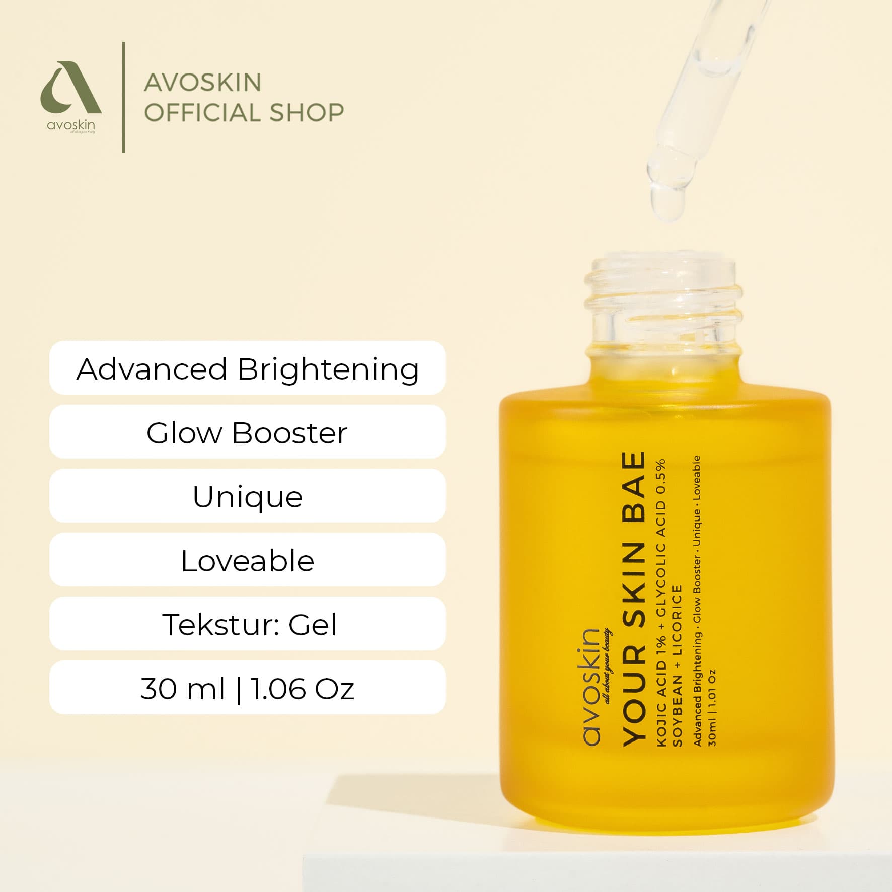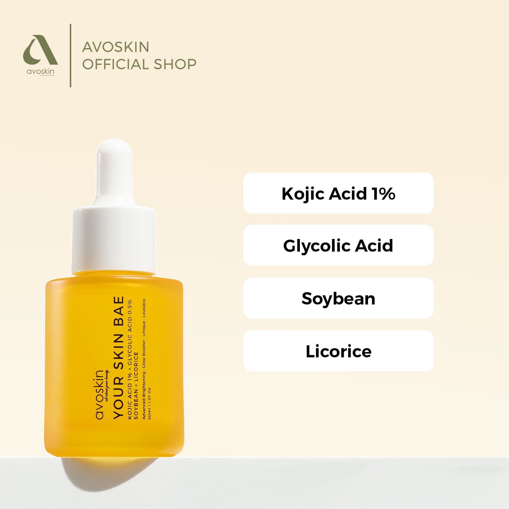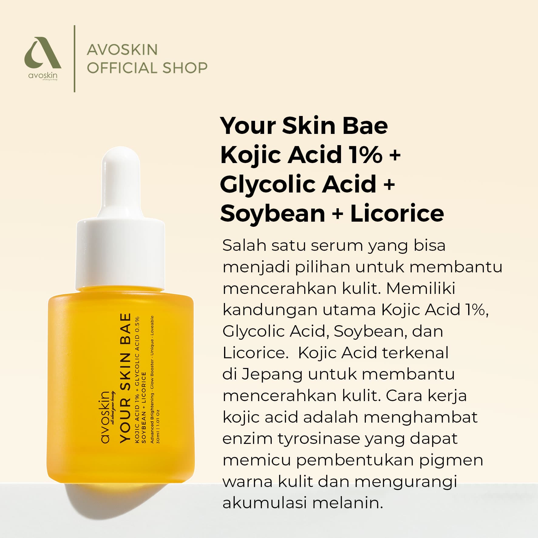 Salah satu serum dari Your Skin Bae Series yang bisa menjadi pilihan untuk membantu mencerahkan kulit. Memiliki kandungan utama Kojic Acid 1%, Glycolic Acid, Soybean, dan Licorice yang berfungsi untuk membantu mencerahkan dan meratakan warna kulit, membantu mencerahkan area yang tampak lebih gelap akibat paparan sinar matahari, dan menyamarkan bintik hitam pada wajah. Kojic Acid terkenal di Jepang untuk membantu mencerahkan kulit. Cara kerja kojic acid adalah menghambat enzim tyrosinase yang dapat memicu pembentukan pigmen warna kulit dan mengurangi akumulasi melanin sehingga bisa membantu menyamarkan Post Inflammatory Hyperpigmentation (PIH).